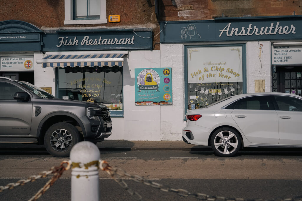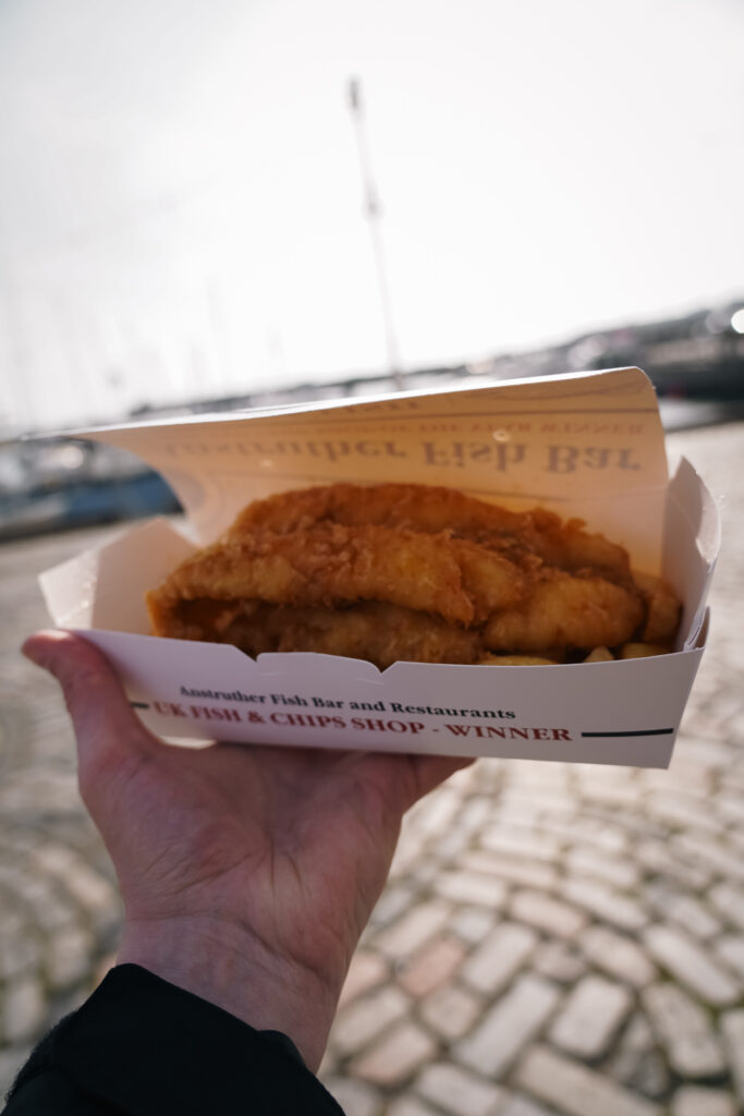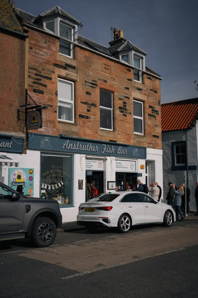 Als je iets móét doen in Anstruther, dan is het wel fish and chips eten. De bekendste plek is de Anstruther Fish Bar. Deze zaak heeft meerdere prijzen gewonnen en is dan ook een van de trekpleisters van het dorp. Uiteraard moesten wij ook even proberen of de vis écht zo goed was. We waren niet de enige met dit idee, de rij stond tot ver buiten de deur op de stoep. Maar na bijna een uur in de rij staan hadden we een portie in ons handen. En ja, de vis was erg lekker!
