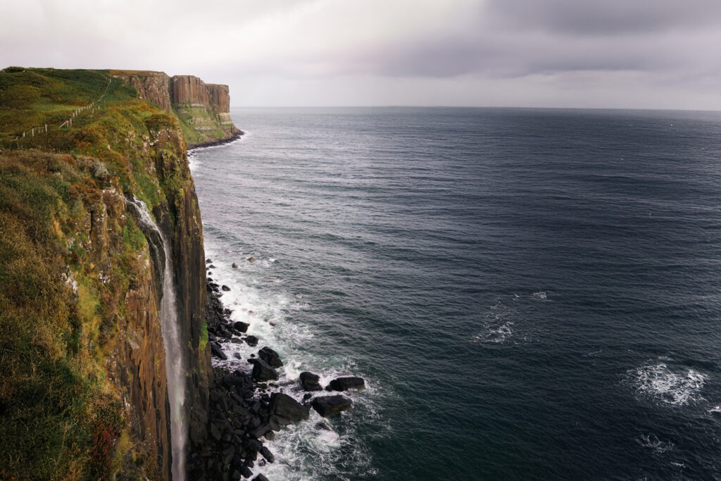 Direct naast Kilt Rock ligt Mealt Falls, een van de bekendste watervallen van Skye. Het water stroomt vanuit Loch Mealt en stort recht de zee in. Wat deze waterval bijzonder maakt, is dat hij niet eindigt in een rivier of meer, maar direct in de oceaan. Vrij bijzonder én zeldzaam.