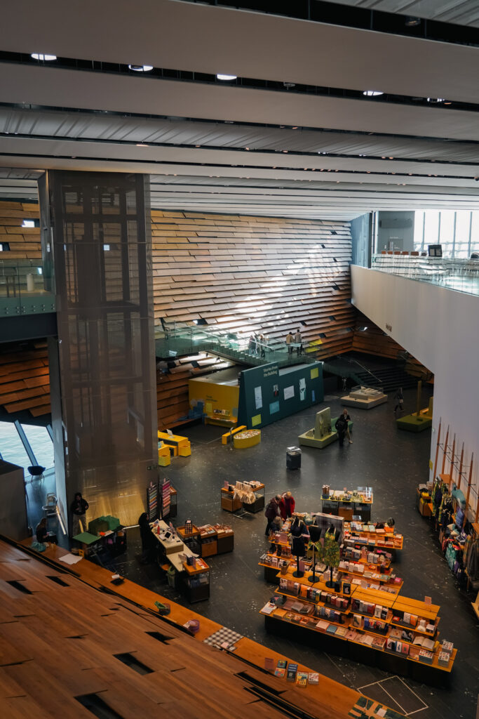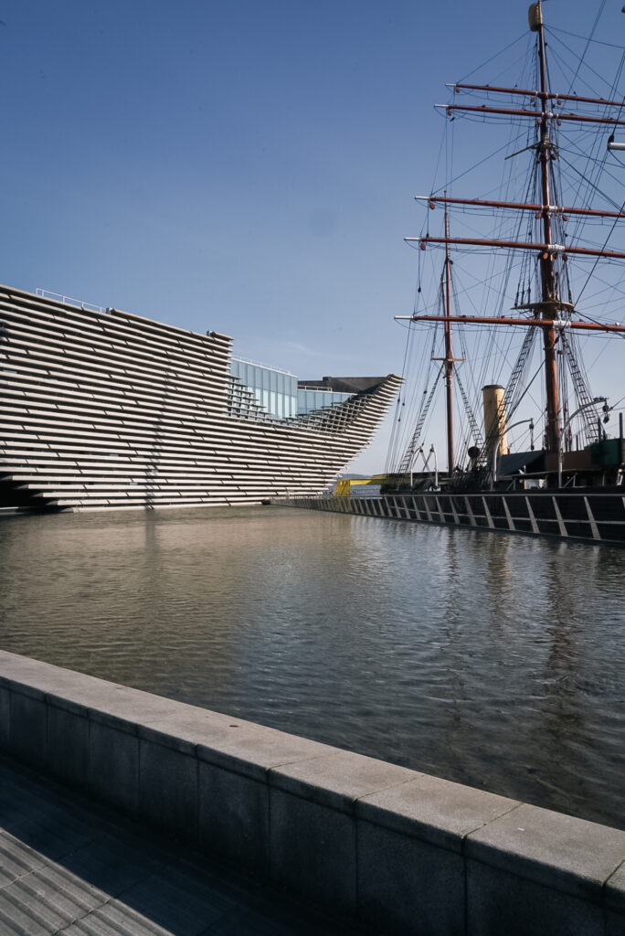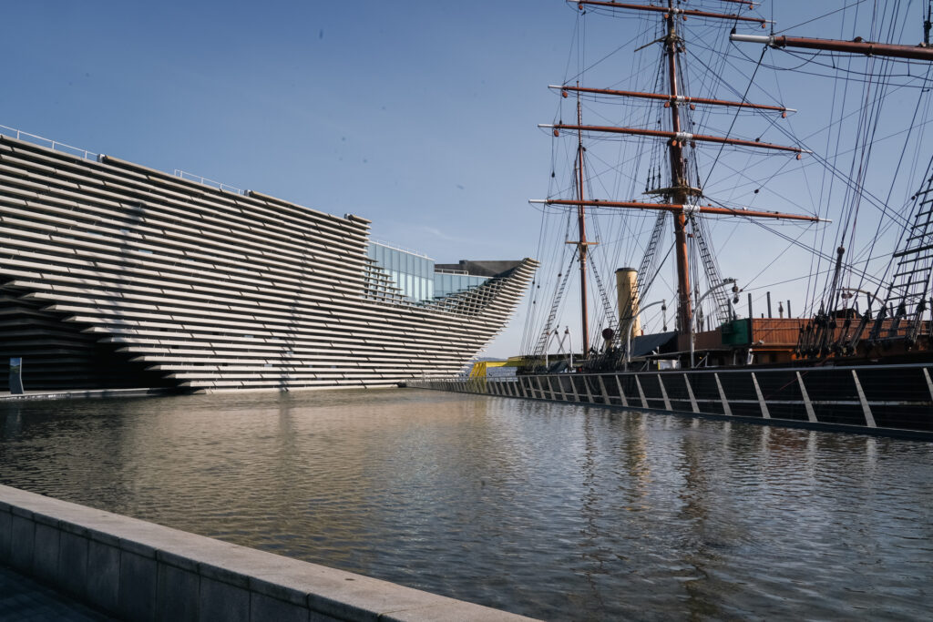 Dé publiekstrekker van de stad is het V&A Museum Dundee. Dit is het eerste V&A museum buiten Londen en het gebouw alleen al is de moeite waard. Het ontwerp van de Japanse architect Kengo Kuma is geïnspireerd op de Schotse kliffen en dat merk je zodra je ernaast staat. Het steekt als een soort rots over het water heen. Tof gedaan.