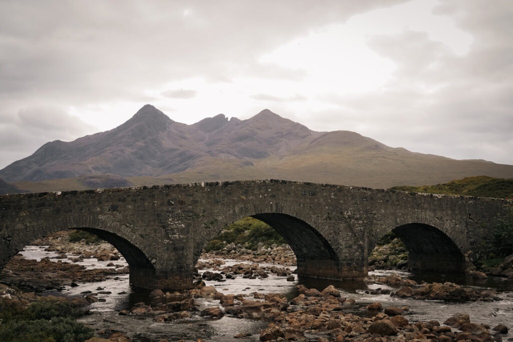 De eerste stop is Sligachan Bridge, hier kun je een prachtige foto maken van deze oude brug met op de achtergrond de Cuillin Mountains.