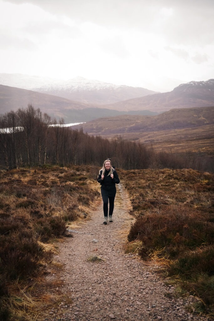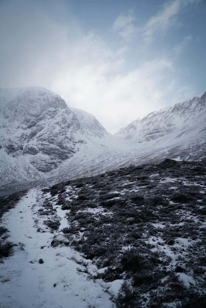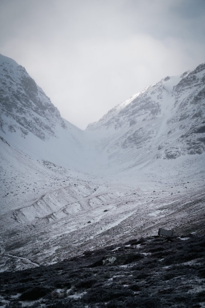 Wij waren hier in februari 2024 en er lag sneeuw op de toppen. Wij hebben dan ook gekozen om de hike naar Coire Ardair te doen. De andere wandelingen waren in deze tijd van het jaar voor ons geen optie. De Coire Ardair hike is 12 kilometer lang en duurt ongeveer 4 uur. Je moet ook rekening houden met ongeveer 450 hoogtemeters. We begonnen de wandeling vanaf de parkeerplaats in het groen en met een zonnetje. Op twee derde begon het alleen hevig te sneeuwen, waardoor we niet heel erg ontspannen een broodje hebben kunnen eten met het mooie uitzicht vanaf het bankje. We hebben snel een paar foto’s geschoten en zijn weer teruggelopen.
