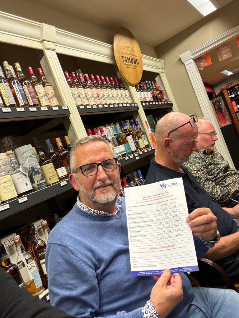 Begin oktober mochten papa en Jorrit weer eens naar de Vidra geweest voor een proeverij op de vrijdagavond. Waarbij het invullen van het bestelformulier na 8(!) whisky toch iets makkelijker ging. De rekening? Die werd doorgezet naar mama.