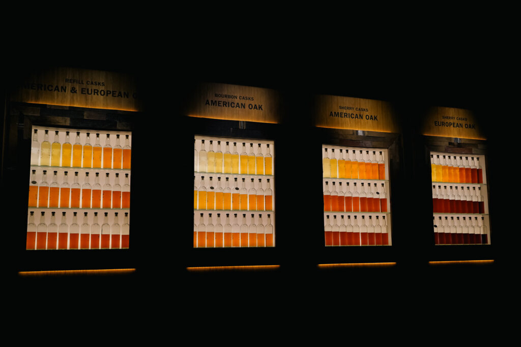 Onderweg naar Warehouse 1. vertelde Devin ons nog iets bijzonders. De distilleerderij ligt precies op de grens tussen de Highlands en Lowlands. Daardoor rijpen de vaten die niet in Warehouse 1 liggen in de Lowlands en niet in de Highlands. Maar door de regels van de Scotch Whisky Association blijft het toch een Highland whisky heten, waar ze erg blij mee zijn. In Warehouse 1. kregen we nog de effecten van tijd en type vaten op de kleur van whisky te zien, wat ze op een hele interessante manier lieten zien. Op naar de tasting.