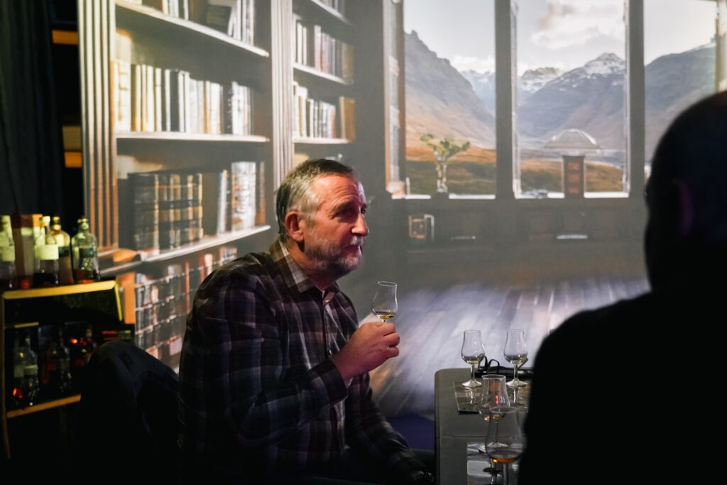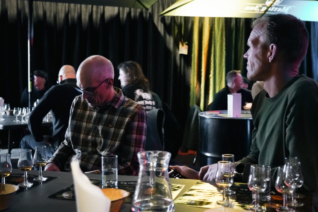 In de loods achter de slijterij was ditmaal een sfeervolle tasting ruimte gecreëerd vanwege de grote hoeveelheid aanmeldingen. Tony had zelfs een enorm doek meegenomen waardoor het leek alsof we midden in de Highlands zaten.